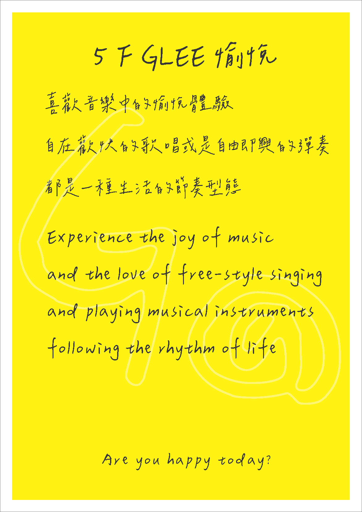 喜歡音樂中的愉悅體驗,自在歡快的歌唱或是自由即興的彈奏,都是一種生活的節奏型態。Are you happy today?