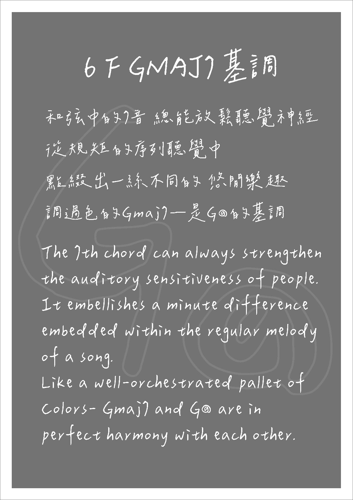 和弦中的7音,總能放鬆聽覺神經,從規矩的序列聽覺中,點綴出一絲不同的悠閒樂趣 ,調過色的Gmaj7—是G@的基調