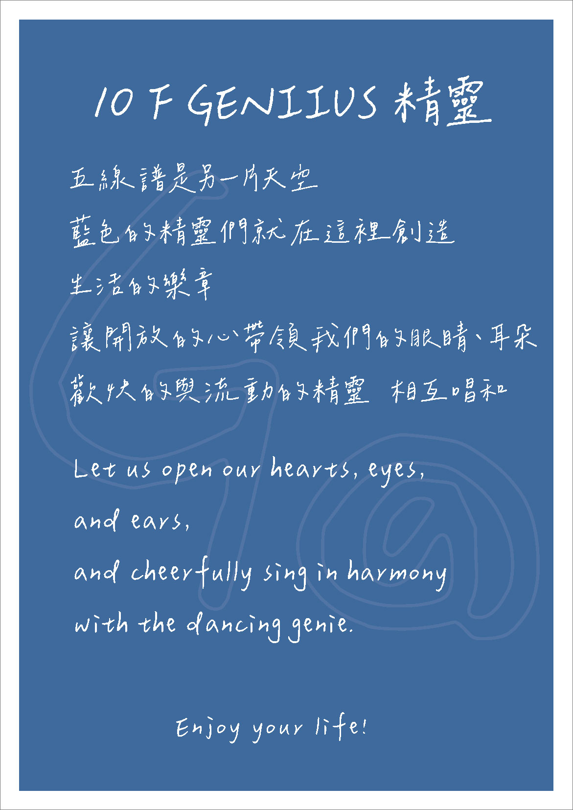 五線譜是另一片天空,藍色的精靈們就在這裡創造生活的樂章,歡快的與流動的精靈,相互唱和。 Enjoy your life!