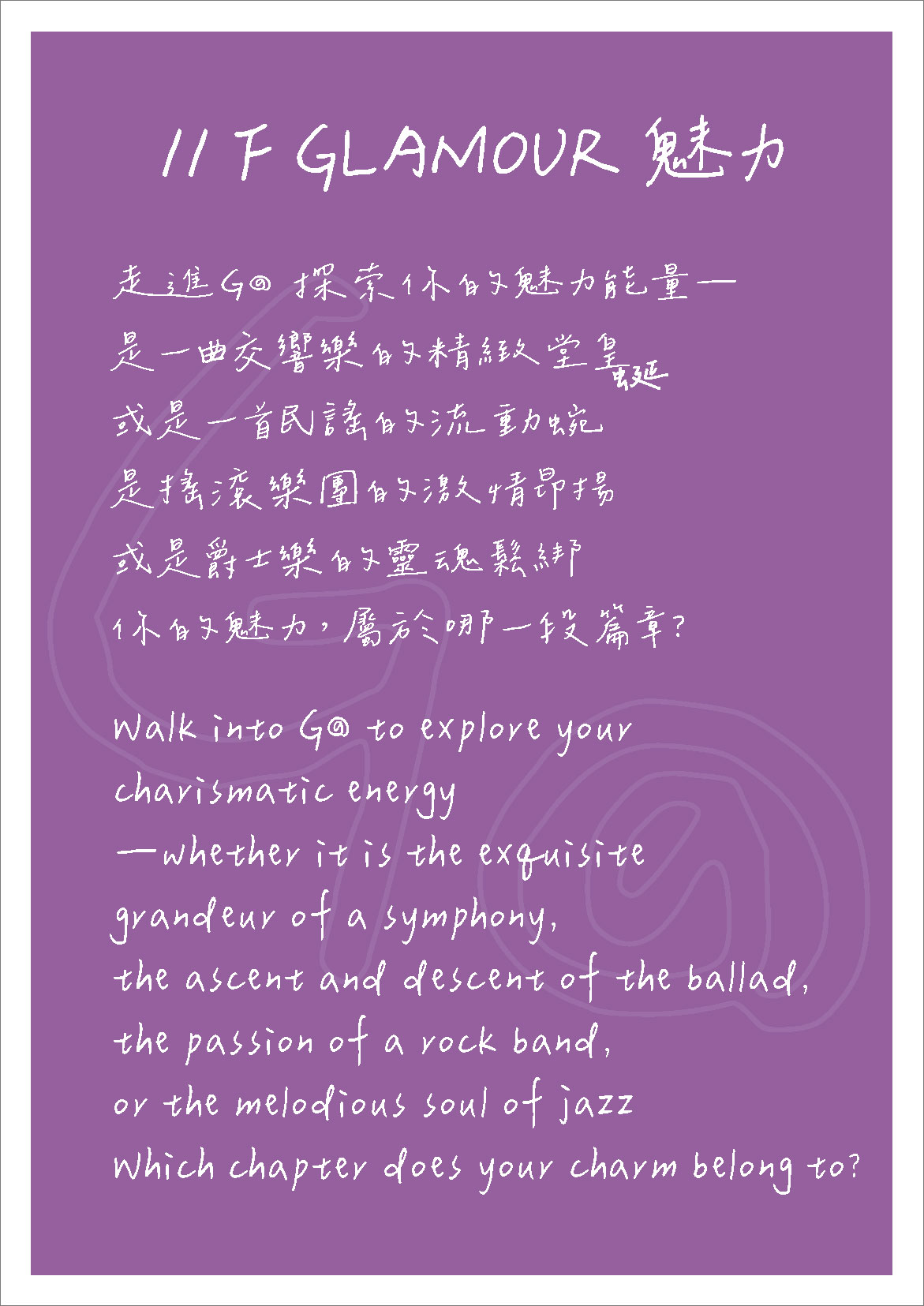 走進G@ 探索你的魅力能量— 是一曲交響樂的精緻堂皇,或是一首民謠的流動蜿蜒,是搖滾樂團的激情昂揚,或是爵士樂的靈魂鬆綁 / 你的魅力,屬於哪一段篇章?