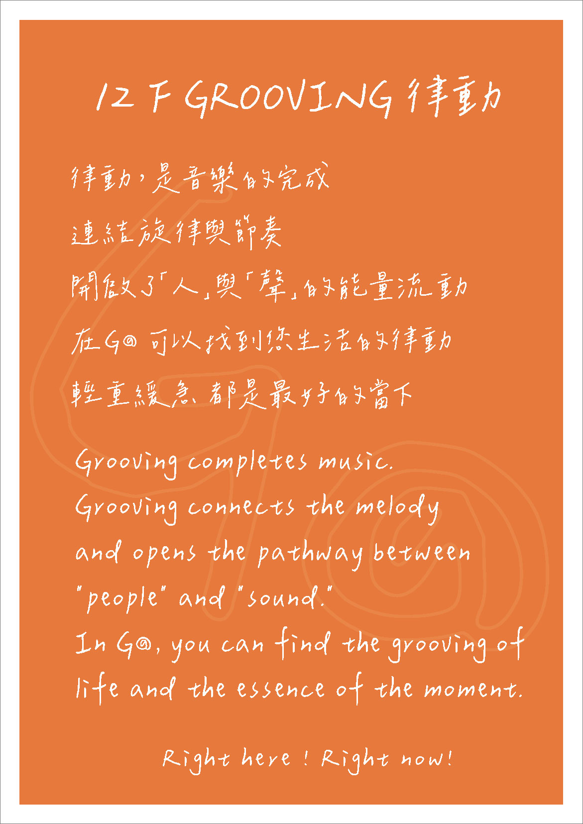 律動,是音樂的完成,連結旋律與節奏,開啟了「人」與「聲」的能量流動,在G@ 可以找到您生活的律動,輕重緩急,都是最好的當下。 Right here ! Right now!